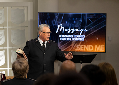 Commissioner Lee Graves, territorial commander, sent the delegates out on Sunday morning with a message of encouragement based on the weekend’s Scripture theme, Isaiah 6:1-8, reminding them that while they may feel unqualified and ill equipped to enter into vocational ministry, it is God himself who qualifies them. Commissioner Graves noted that when they respond to God’s invitation into a relationship with Jesus, and when they accept his sanctifying grace, they are then qualified to go out and participate with the Lord in whatever transformational work he is calling them to do.