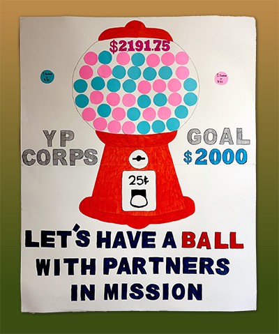 As part of the corps’ overall target of $41,000, the youth department set out to raise $2,000 through fun and interactive activities. Marsh makes a large gumball machine out of poster board and as money is raised toward the Partners in Mission goal, it slowly fills up with blue and pink gumballs—aboys-versus-girls race to the top.