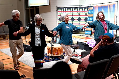 In the evening, Jonathan Maracle (Mohawk), founder and lead singer of the music group Broken Walls, performed a concert and shared some of his own journey to reclaim his Indigenous identity as a follower of Christ. He was accompanied by Kenneth Wallace on the drum, who also joyfully led the audience to leave their seats and join in a dance around the room.