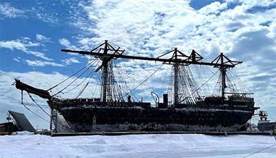Putting on the elaborate garb of a sailor aboard the ice-bound ship that plays an important part in the movie and walking onto the film’s enormous outdoor ship set was awe-inspiring. It seemed like no expense was spared to create this elaborate, authentic-looking (and seemingly life-sized) vintage vessel. Hydraulics could tilt it at different angles to simulate the boat being in turbulent, icy waters. I was shown how to act and what to do to give the illusion that I was a seafarer helping my shipmates navigate a vessel under extreme and frightening circumstances—and I gave it my all!