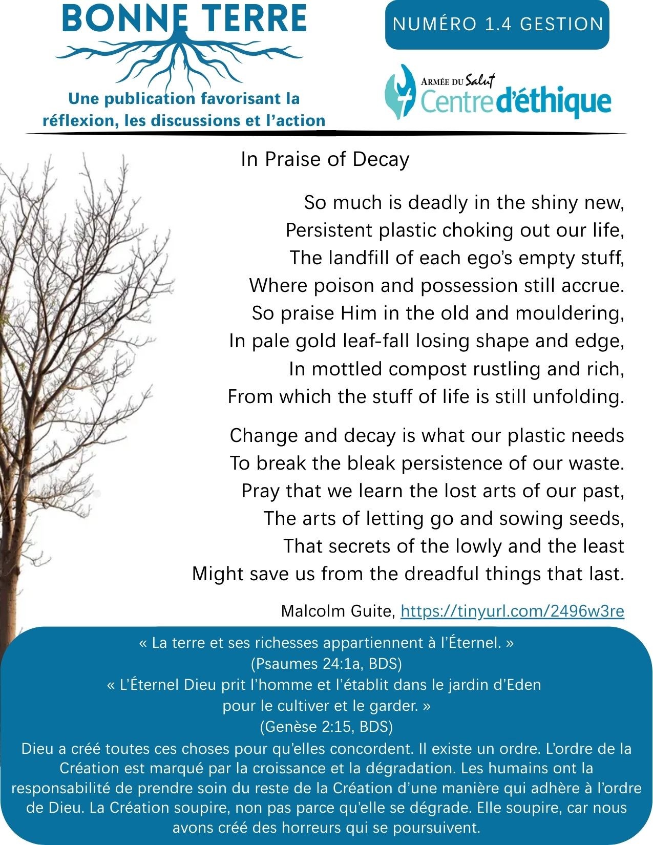 Bonne terre est une publication que le Centre d’éthique fait paraître cinq fois par année. Le titre est inspiré d’un passage de la parabole du semeur. Au passage Marc 4:20 (BDS), Jésus nous enseigne que « (…) ceux qui reçoivent la semence “dans la bonne terre” (…) sont ceux qui écoutent la Parole, qui la reçoivent et qui portent du fruit (…) ».