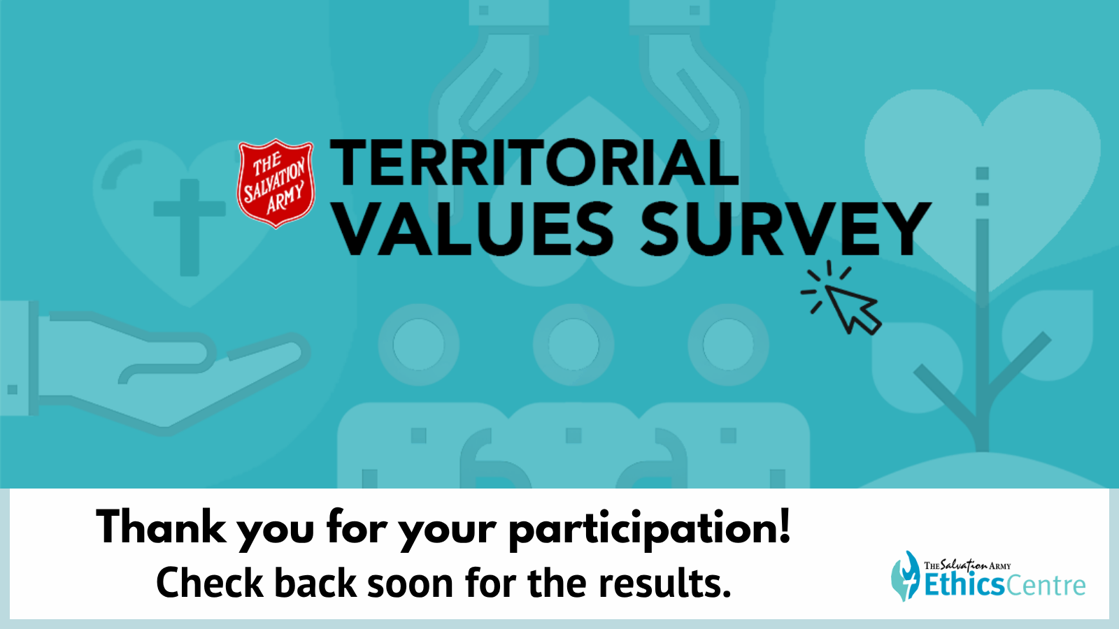 If you have any questions or feedback about the Territorial Values Survey or our territorial values, please get in touch with us at ethics@salvationarmy.ca.